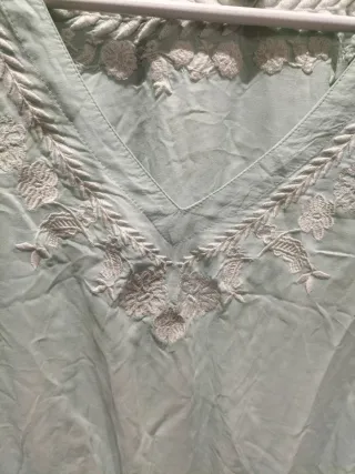 Vestido túnica con un bonito bordado central y detalles de lentejuelas. - Diseño de cuello mao. - Manga larga. - Bordado multicolor en la parte delantera. Está en perfecto estado salvo por un pequeño defecto en un lateral (última foto).