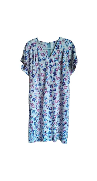 - Vestido floral con túnica a juego - Vintage años 80 - Manga corta - Cierre con cremallera en centro trasero - Forro interno de poliester - Hacho a mano - Abertura trasera en el bajo de 18 cm - Material: 100% poliester (interior y exterior) - Talla: 42 - Medidas: Vestido Ancho de sisa: 62 cm Contorno de cintura: 50 cm Largo de prenda: 107 cm Largo de manga: 29 cm (desde cuello) Túnica - Manga murciélago y francesa Ancho de sisa: 71 cm Largo de prenda: 90 cm Largo de manga: 71 cm (desde cuello)
