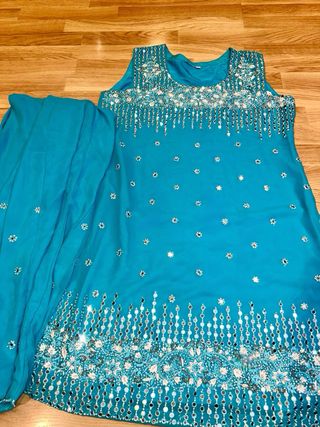 Conjunto de kurta y pantalón de inspiración Bollywood, con un vibrante color azul y detalles plateados. - Diseño sin mangas. - Adornado con intrincados bordados y espejos. - El pantalón a juego complementa el diseño. - Ideal para ocasiones especiales o festividades.
