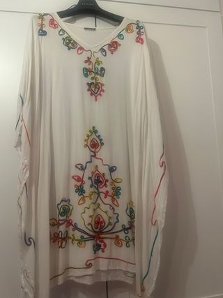Preciosa túnica playera blanca con bordados de colores. Ideal para tus días de playa o piscina. - Bordados artesanales - Tejido ligero y fluido - Diseño único y favorecedor tiene 2 pequeños descosidos