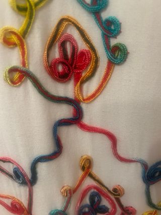 Chaqueta tipo túnica con bordados y semi transparente. Da un toque muy guay a un look sencillo. Llega por debajo de la rodilla, mido 170 cm. Mangas 3/4. Queda anchita. Hago descuento del 10% por la compra de 3 productos de ropa o bolsos. No regateo salvo compras de más de 4 productos cualesquiera :)
