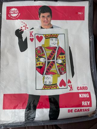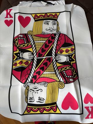 Disfraz de túnica con diseño de carta de rey de corazones. Ideal para fiestas temáticas, juego de naipes, - Diseño de carta de rey de corazones. - Talla L. En muy buen estado.