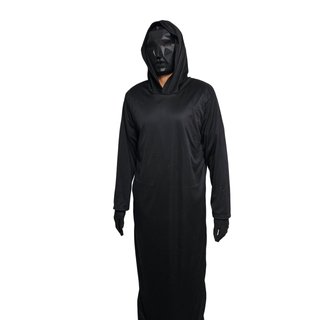 Disfraz de segador siniestro. - Diseño en color negro con detalles - Talla única. - solo túnica con capucha. Perdimos el cinturón que era una cuerda, por eso el precio.