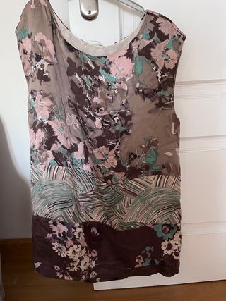 Túnica top sin mangas en estampado de flores color berenjena, visón, verde. Con un tejido excepcional, 100% seda. El Top incorpora forro. Está impecable. Diseño italiano. Talla 44 italiana. Equivale a una 40.