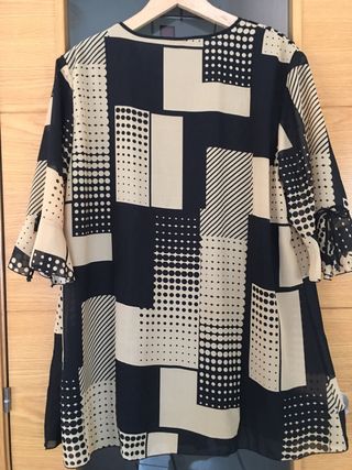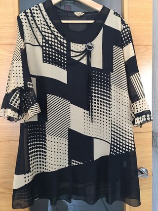 kasaca, tunica de gasa manga corta con forro interior. Las fotos distorsionan un poco el color, es negra y beige amarillento, muy bonita.