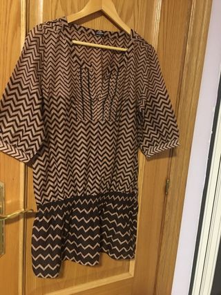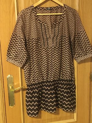 Vestido tipo túnica con estampado de zigzag. - Diseño con cuello en V y detalles de pedrería. - Cintura elástica para un ajuste cómodo. - Mangas cortas abullonadas.