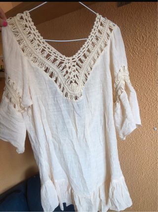 Preciosa túnica de verano en color beige de la marca Penelope Chic. Talla S/M. Es una prenda delicada y elegante, ideal para ocasiones especiales. ÚLTIMO PRECIO!!! - Confeccionada en gasa ligera. - Adornada con detalles de pedrería y flecos. - Cuello en pico con bordado artesanal. - Diseño fluido y favorecedor.