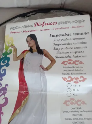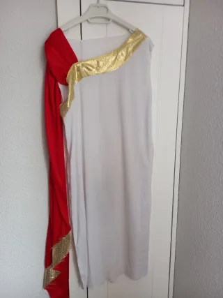 Disfraz de emperatriz romana, ideal para fiestas temáticas o disfraces. Mide 90 cm. Se cortó para que quedase por la rodilla. - Túnica blanca con detalles dorados. - Cinturón. - Brazaletes dorados. - Talla M-S
