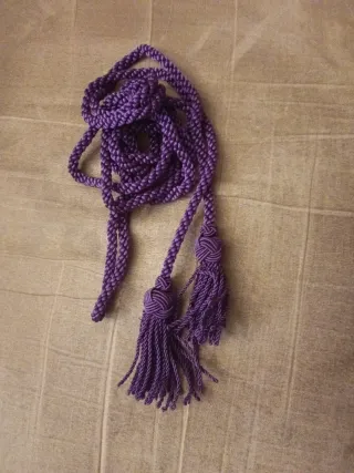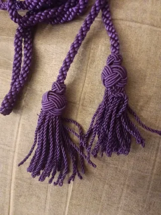 Cingulo de seda fino en color morado. Para túnicas y hábitos de Semana Santa. Largo 2'80 cm incluyendo las borlas. Ancho 0'50 cm Adaptable a todas las medidas. Nuevo. Procede de cierre de tienda - Elaborado con seda. - Diseño trenzado.
