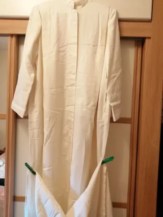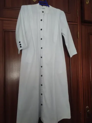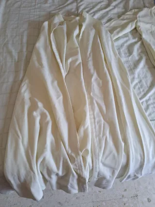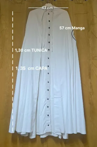 Tunica y capa blanca en buen estado. - Túnica de manga larga. - Cuello mao. - Cierre de botones hasta medio pecho. Medidas: 43 cm de anchura de hombro, 45 cm largo de manga y 107 largura hasta el borde Tiene algo de cera pero blanca pero poquisimo.