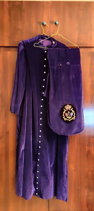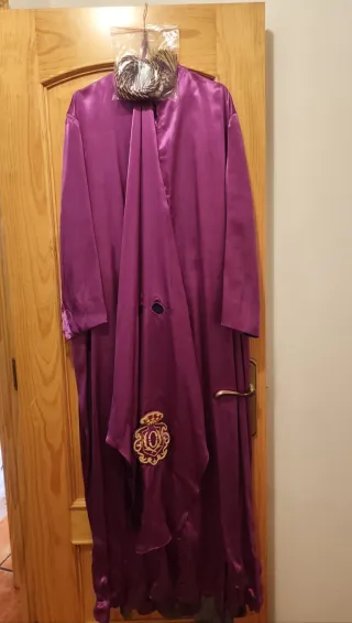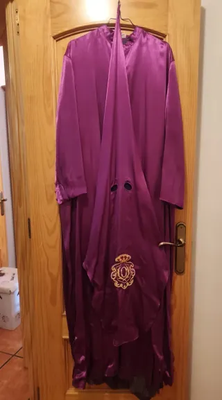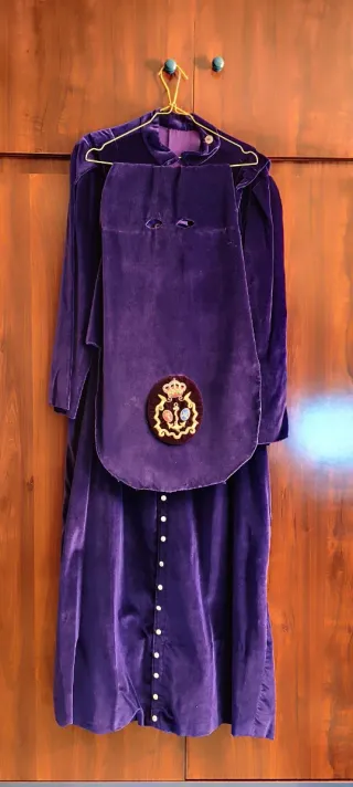 Se vende túnica de nazareno completa, incluyendo capa y antifaz. - Túnica de terciopelo morado. - Capa blanca. - Antifaz morado. - Incluye botones. Y escudos y limpia de tintorería