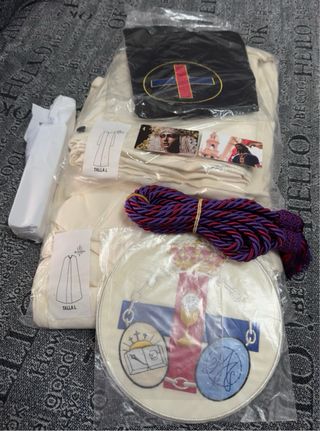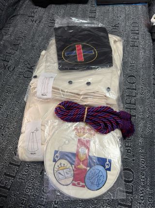 Conjunto de túnica y accesorios para hermandad. - Túnica de color beige. - Incluye un escudo circular bordado con motivos religiosos. - Se acompaña de un cordón trenzado en tonos morado y rojo. - Incluye un paño negro con un emblema ovalado bordado. Tunica capa cingulo escudos y antifaz Regalo capirotes Regalo 200 estampitas