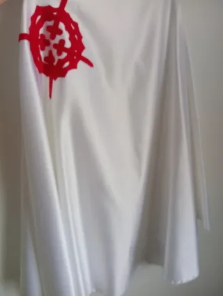Túnica de Semana Santa de Zamora. Estameña blanca válida para múltiples procesiones: Espiritu Santo, Buena Muerte, Vía Crucis, Silencio, Siete Palabras, Yacente y Nuestra Madre. Medidas: largo túnica 116 cm, manga 42 cm (desde la costura del hombro).