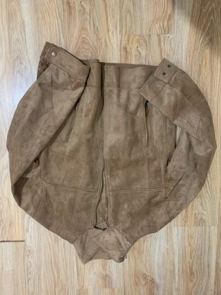Abrigo de estilo moderno. - Material tipo ante. - Cierre de cremallera. - Bolsillos frontales con cremallera. - Detalle de botones en los puños.