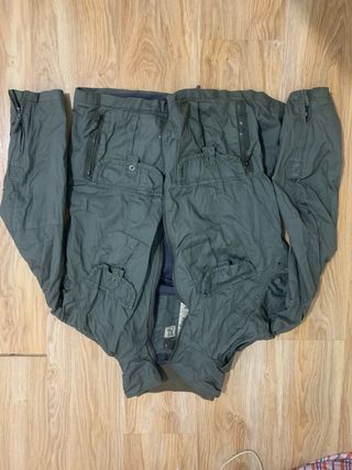 Abrigo de color verde militar con múltiples bolsillos y cremalleras. - Diseño con bolsillos frontales. - Cierre de cremallera. - Puños ajustables con cremallera.