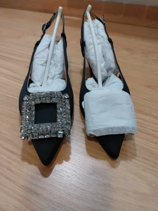 Elegantes zapatos de salón Bibi Lou. -Precio en tienda 140€ -Estan nuevas, nunca usadas - Color negro. - Adorno de pedrería plateada en la pala. - Diseño destalonado con tira al tobillo.
