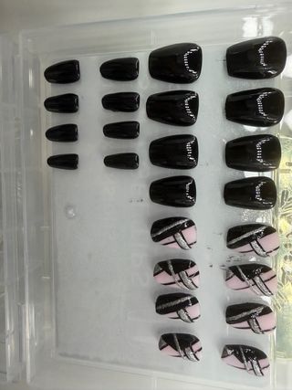 Set press on nails con diseño hecho a mano, en negro y plata, mate y brillo. En uña en forma de bailarina y corta. Bonitas, elegantes, perfectas para quien no se apaña con uñas largas. El set incluye: - 24 unidades de uñas en todas las tallas para adaptarlas a las tuyas. - Aceite para retirar cutícula. - Aceite para nutrir cutícula después. - Pegamento para uñas. - 2 toallitas para limpiar la uña antes y después de la puesta. - Bolsita con lima, palito de naranjo, cepillo de uñas y buffer. - Hojita con instrucciones y consejos para su puesta. Todo lo necesario para una manicura de salon en casa.