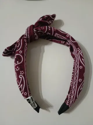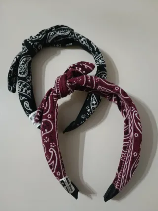 Set de dos diademas con diseño de pañuelo anudado. El lazo lo puedes poner como quieras ya que lleva alambre por dentro para amoldarlo como prefieras. - Una diadema es negra con estampado paisley blanco. - La otra diadema es de color burdeos con estampado paisley blanco. - Ambas son de la marca Claire's.