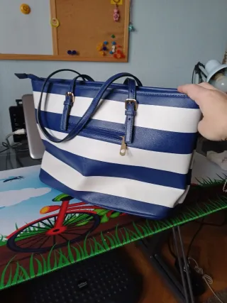 Bolso de mano con un diseño de rayas clásico. - Combinación de colores azul y blanco. - Detalle de logo metálico.