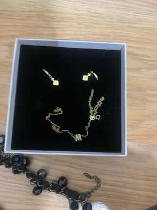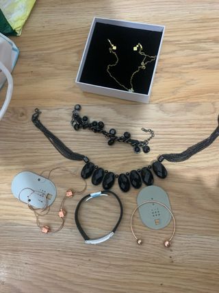 Lote variado de accesorios de joyería. - Collar con colgantes negros. - Collar fino con detalles dorados. - Pulsera de cadena negra. - Pulsera rígida dorada con bolas. - Pulsera de hilo con cubos. - Pendientes dorados cuadrados.