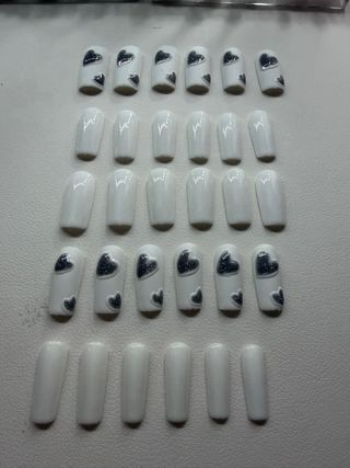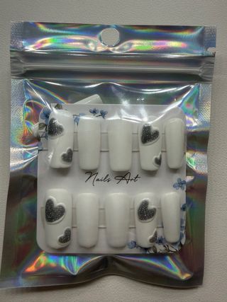 Set press on nails set en color blanco con diseño de corazón plateado en 2 uñas. Dibujado a mano. El set incluye: - Uñas en todas las tallas. - Pegamento para uñas. - Removedor de cutículas y aceite de cutículas. - Removedor de pegamento. - Bolsita con lima, buffer, palito de naranjo y cepillo para uñas. - 2 toallitas cleaner para antes y después de la puesta. - Instrucciones y consejos de uso. Este diseño ya está listo para su envío, pero puedes pedir el tuyo sin problema. Hechos a mano totalmente. Pregunta sin compromiso.