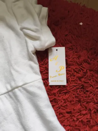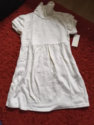 Vestido blanco con cuello alto y manga corta. La parte superior tiene un diseño fruncido. - Cuello alto. - Manga corta. - Diseño fruncido en la cintura.