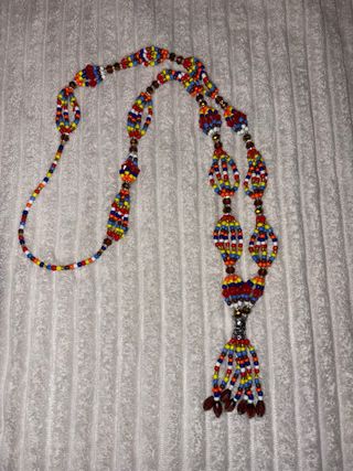 Collar de Cabecera de Ozain. - Diseño con múltiples cuentas. - Colores variados que incluyen rojo, azul, amarillo y blanco... - Adornado con cuentas de forma ovalada y detalles en forma de lágrima en la parte inferior. - Se puede realizar de cualquier orisha que se quiera