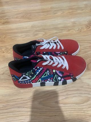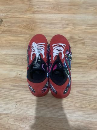 Zapatillas deportivas con un diseño llamativo y vibrante. - Combinación de rojo con múltiples colores. - Cordones blancos. - Estampado gráfico único.