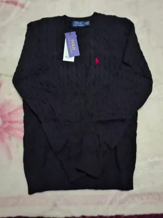 Jersey de Polo Ralph Lauren en color negro, con el icónico logo del jinete bordado en rojo. - Diseño de punto trenzado. - Cuello redondo. - A estrenar, con etiquetas.