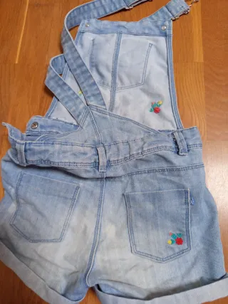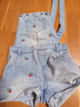 Mono corto de tela vaquera para niña. talla 8.Presenta un diseño divertido con bordados. - Tirantes ajustables. - Bolsillos delanteros y traseros. - Bordado floral en la parte delantera y trasera.