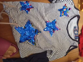 Camiseta de manga larga con un diseño llamativo de rayas y estrellas. Dibujo cambia de color al pasar la mano. - Estrellas decoradas con lentejuelas brillantes. - Combinación de rayas blancas y negras.