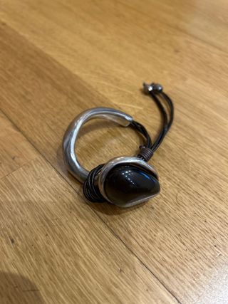Pulsera de la marca Uno de 50 con un diseño único. - Pieza central con piedra negra. - Detalle de plata. - Cierre ajustable con cordón. cuerdas marrones tengo también el collar a juego