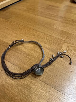 Elegante collar de la marca Uno de 50 con un diseño único. - Gargantilla de metal plateado. - Cordones marrones. - Colgante con piedra semitransparente. - Detalle de esferas metálicas.