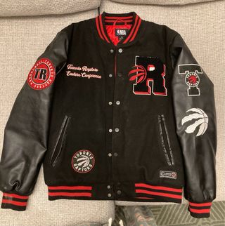 Cazadora de los Toronto Raptors. - Diseño con mangas de cuero. - Parches y bordados del equipo. - Cuello y puños a rayas.