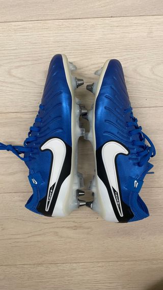 Botas de fútbol Nike Tiempo en llamativo color azul y blanco. Diseñadas para ofrecer un gran rendimiento en el campo. -Gama alta - Cierre de cordones. - Suela con tacos de aluminio para césped natural.