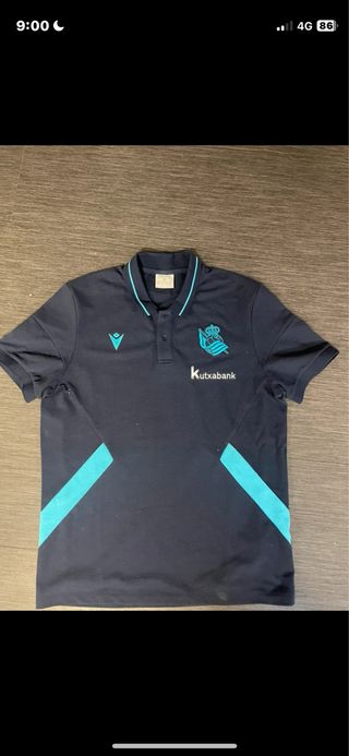 Polo oficial de la Real Sociedad, marca Macron. Diseño moderno con detalles en turquesa. - Cuello tipo polo con ribete. - Logo de Macron bordado en el pecho. - Escudo de la Real Sociedad bordado. - Inscripción Kutxabank en el pecho. - Paneles laterales en contraste de color.
