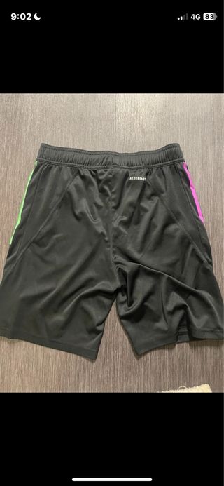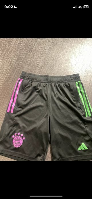 Pantalones cortos deportivos del FC Bayern Múnich. - Diseño con detalles en rosa y verde. - Escudo del club en la pierna izquierda. - Logo de Adidas en la pierna derecha.