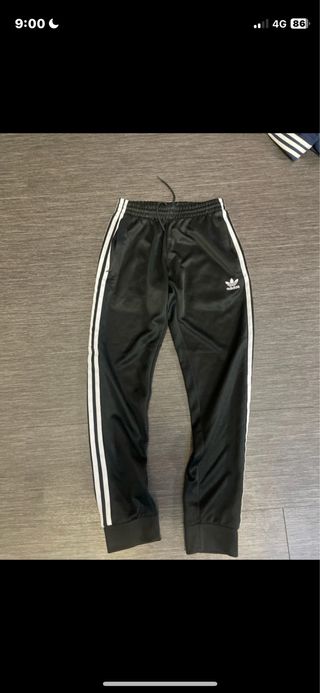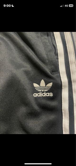 Pantalón deportivo Adidas de color negro con las icónicas tres rayas blancas a los lados. - Cintura elástica con cordón. - Puños ajustados en los tobillos. - Logo de Adidas bordado.