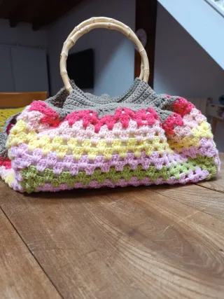 Bolso artesanal de crochet con un diseño colorido y asas de bambú. - Tejido a mano. - Asas de bambú. - Diseño llamativo.