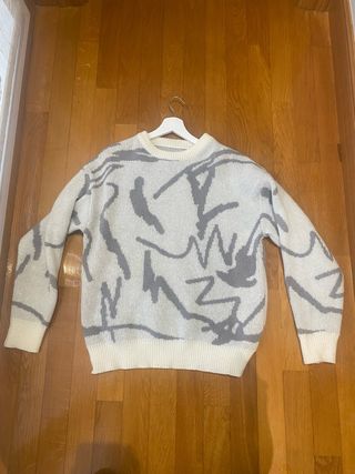 Jersey de punto con un diseño abstracto en gris sobre fondo blanco. El cuello, los puños y el bajo son de canalé en color blanco. - Diseño estampado abstracto. - Cuello redondo. - Manga larga.