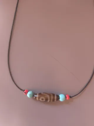 Collar con un auténtico Dzi tibetano. El diseño presenta un patrón distintivo en tonos marrones, complementado con cuentas turquesas y rojas. - Dzi tibetano auténtico. - Cuentas turquesas. - Cuentas rojas.