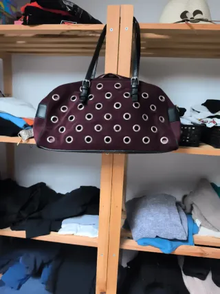 Bolso de mano con un diseño llamativo y moderno. - Acabado aterciopelado en tono morado. - Detalle de múltiples aros plateados en toda la superficie. - Asas negras con hebillas ajustables.