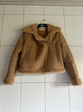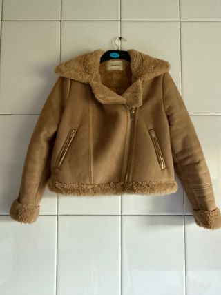 Chaqueta de Stradivarius con forro de pelo. - Color beige. - Diseño tipo aviador. - Cremallera frontal. - Bolsillos laterales con cremallera. - Puños y bajo con pelo. Está en perfecto estado, el único defecto que tiene es el enganche de la percha algo desgastado.