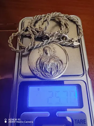 Conjunto de cadena y medalla de plata solo la cadena me costó 100 euros y la medalla 55 . - Peso total: 25.70 gramos. - Medalla con diseño de figura religiosa y estrellas. - Cadena tipo soga. - Cierre de mosquetón.