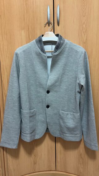 Americana elástica de Zara en color gris. Presenta un diseño moderno y cómodo. - Cierre de dos botones. - Dos bolsillos frontales. - Cuello redondo con detalle de rayas.