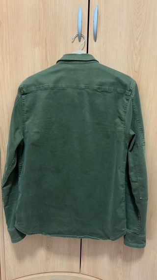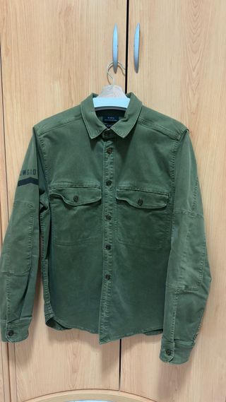 Sobrecamisa de la marca Zara en color verde oliva. Presenta un diseño moderno y funcional. - Dos bolsillos en el pecho con solapa. - Cierre de botones. - Detalle de parches en los codos. - Inscripción en la manga izquierda.
