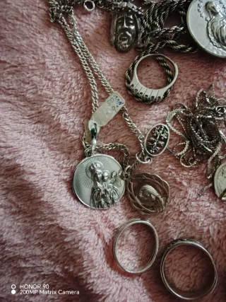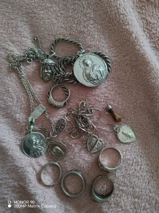 Lote de joyería de plata que incluye una cadena una medalla religiosa, un dije de la cara de Jesús y un anillo la cadena la compré hace unos meses y me costó 90 euros solo la cadena yo vendo el lote entero -cadena nueva que costó 90 euros - Medalla con figura religiosa y estrellas. - Dije detallado de la cara de Jesús. - Anillo de plata. - Peso total: 39.10 gramos.