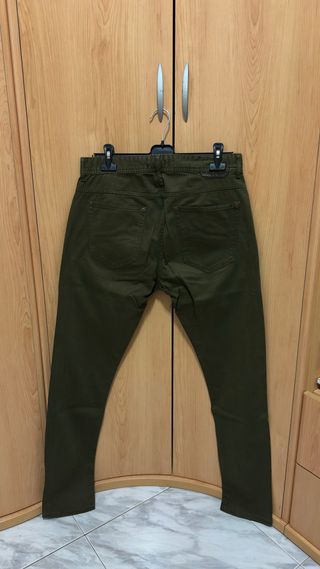 Vaqueros de la marca Zara en color verde oliva. Talla 42. - Diseño clásico de cinco bolsillos. - Cierre de cremallera y botón. - Costuras reforzadas. -Elásticos.