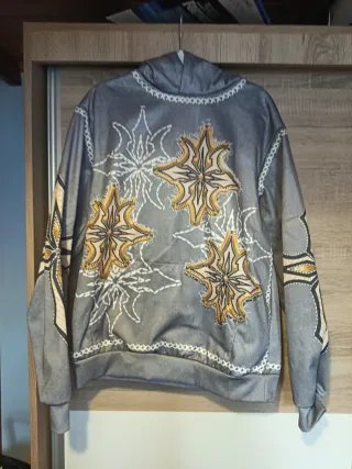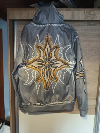 Sudadera con un diseño llamativo y moderno. - Estampado central con motivos dorados. - Detalles de costura blanca. - Mangas con diseño geométrico.