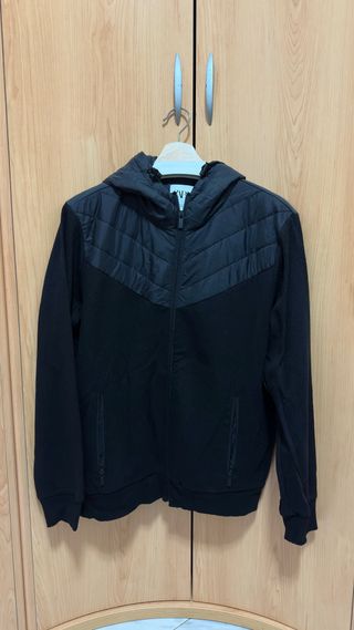 Chaqueta con capucha y cremallera frontal. Presenta un diseño acolchado en la parte superior del torso y mangas de tejido. - Diseño acolchado en el pecho. - Mangas de tejido. - Cremallera frontal completa. - Bolsillos laterales con cremallera.